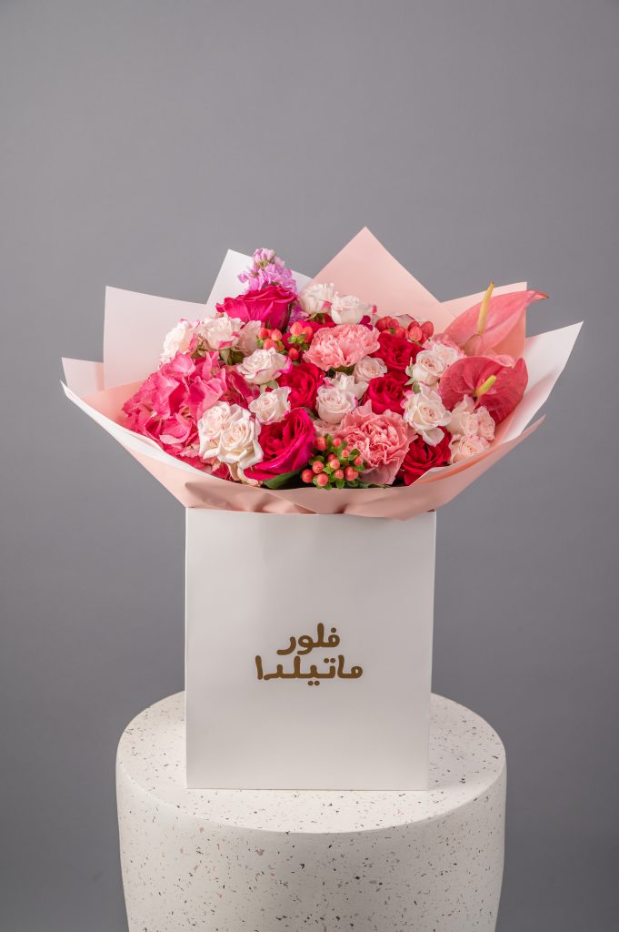 Curated with the finest seasonal blooms in shades of pink and red, this luxurious bouquet blends timeless elegance with modern charm. A stunning mix of roses, carnations, carefully hand-tied and wrapped in pastel elegance—ideal for any occasion worth celebrating