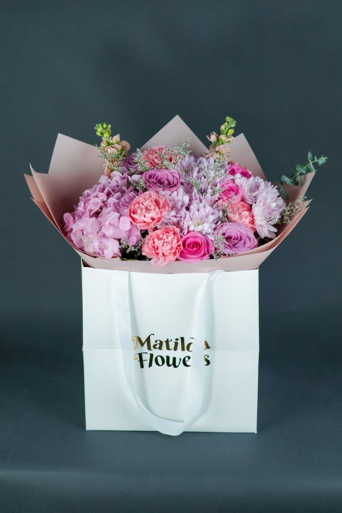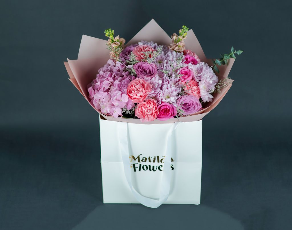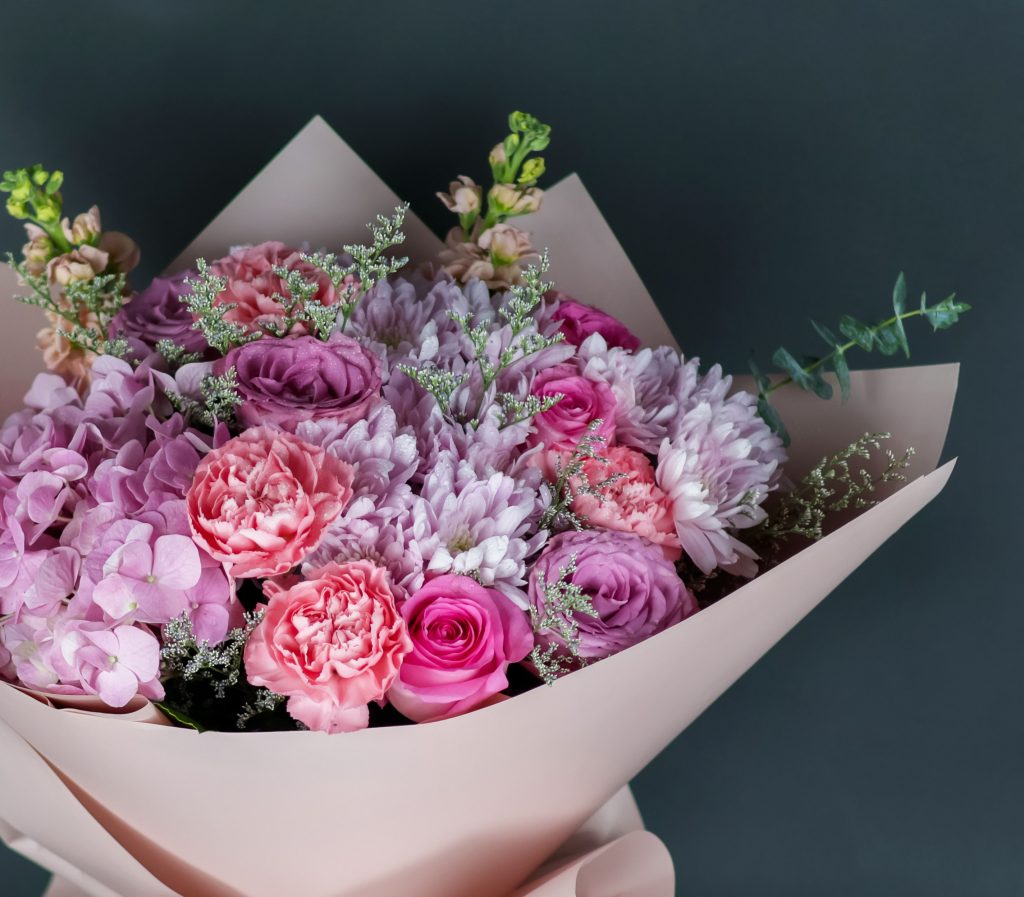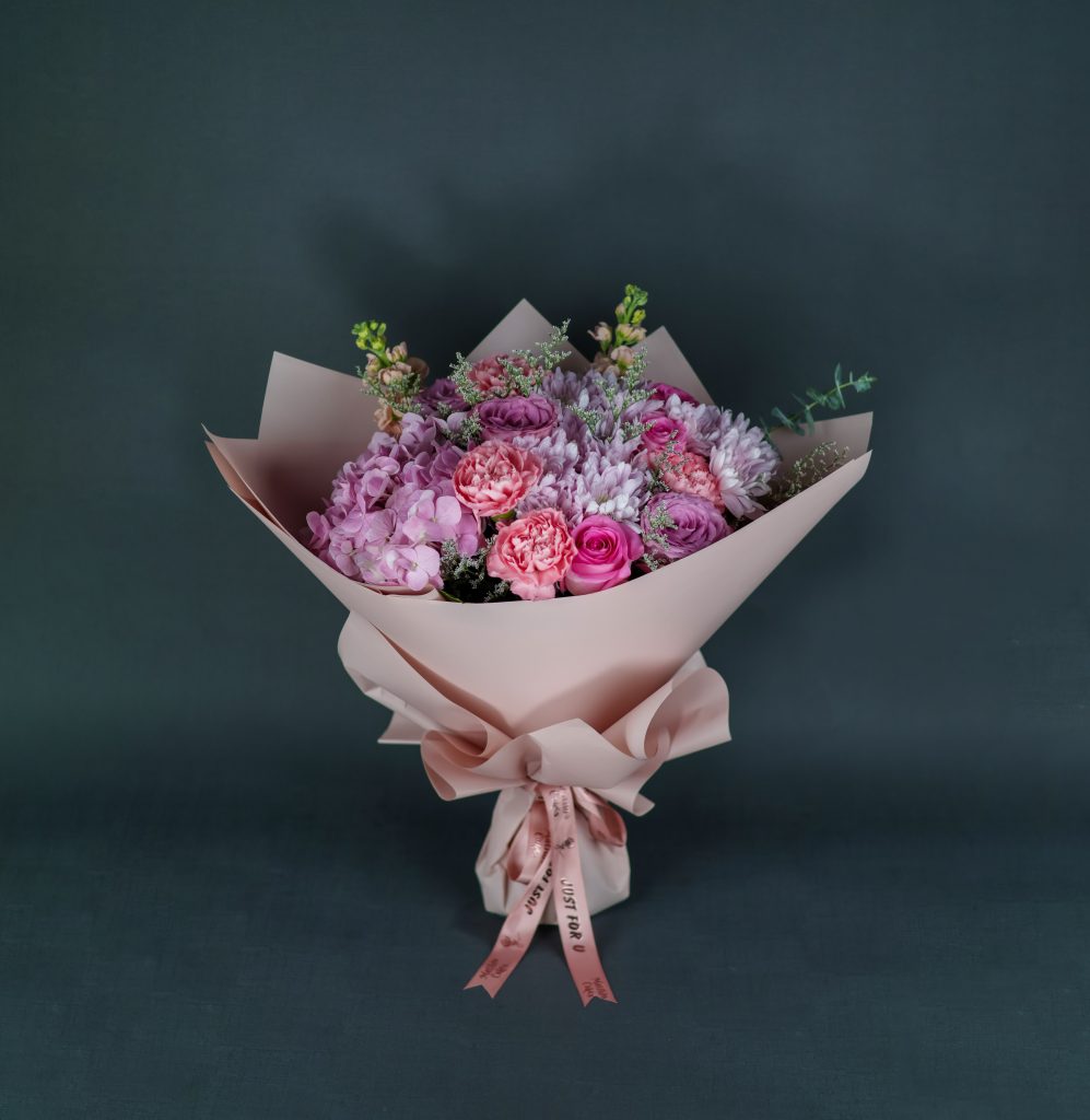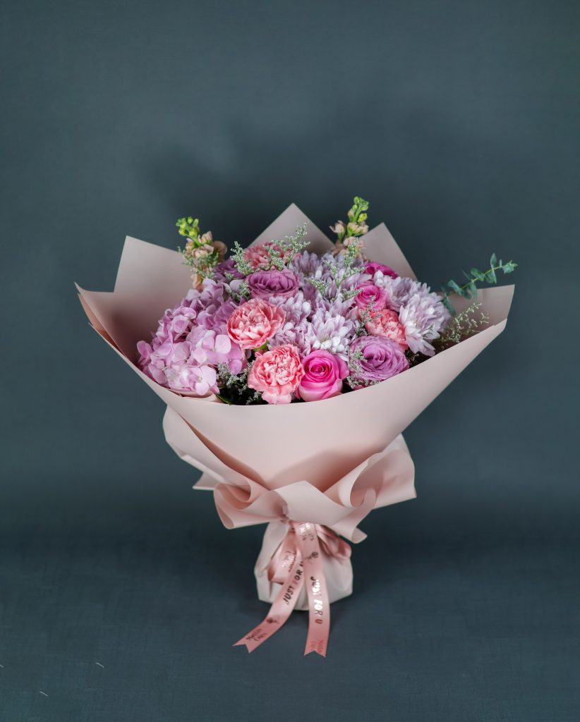 A masterpiece of color and texture, Royal Tapestry is where luxury and artistry intertwine. Lush pink hydrangeas create a sumptuous base, layered with mauve roses, lavender chrysanthemums, and vibrant pink carnations. A true statement bouquet—crafted to embody admiration, sophistication, and timeless beauty